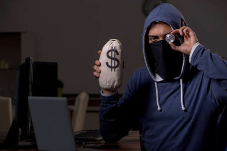 Male hacker hacking security firewall late in office