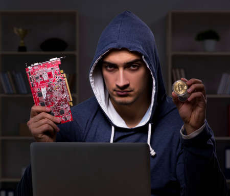 Young man in bitcoin mining concept