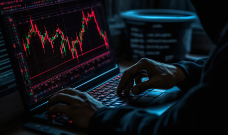 financier works in an online trading terminal, cryptocurrency exchanges and securities exchanges. The investor works late in international markets, a dark cabinet, an image with a small depth of focus