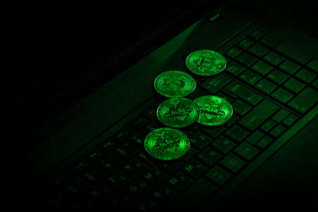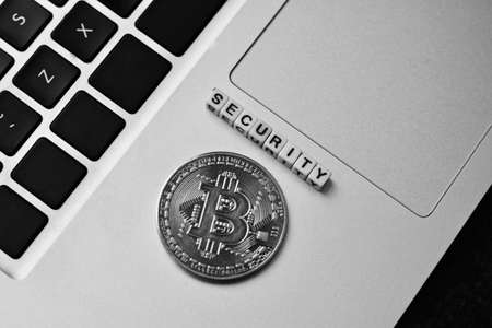 Digital currency physical metal bitcoin coin on the keyboard. Bitcoin security.