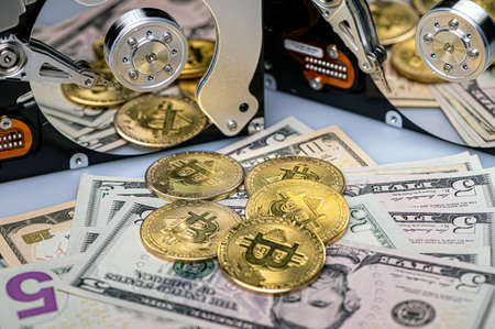 Bitcoin BTC coins, open hard drive and dollar bills, cryptocurrency and digital payment system