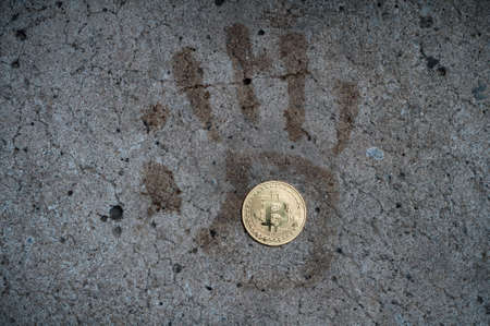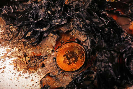 Digital currency physical metal bitcoin coin near steel hammer. Cryptocurrency concept
