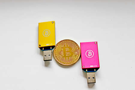 Digital currency physical gold bitcoin coin on the white background. Money concept.