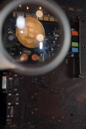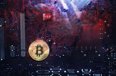 Virtual cryptocurrency money Bitcoin golden coin on Machine controller plates of car part. The future of money. Computational equipment. Blue mother board. Shot directly from above.