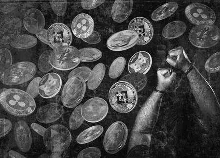 Hands in handcuffs and cryptocurrencies over dark background. Crypto crime concept.