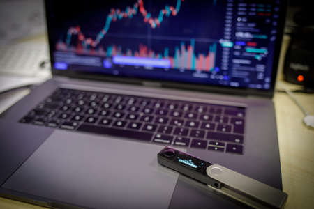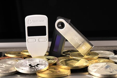 WROCLAW, POLAND - JANUARY 28, 2020: Physical version of Bitcoin (BTC), Trezor and Ledger (cryptocurrency hardware wallets) and black laptop keyboard.
