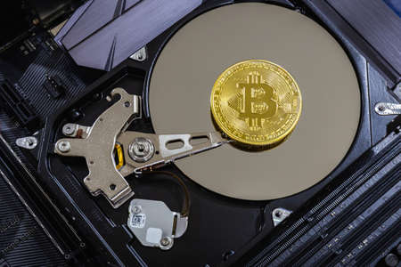 Close up of Golden bitcoin on hard disk computer. It is a new device that is popularly used for crypto. Currency concept and online trading of blockchain backed digital money