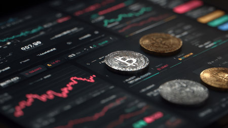 Close-up view of a cryptocurrency trading platform displaying Bitcoin and Litecoin alongside market data, charts, and analytics on a dark-themed interface.