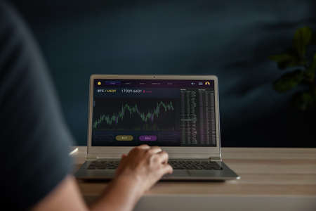 Cryptocurrency Investment Concept. Person Using Computer Laptop at Home to Buy and Sell Bitcoin via Online Exchange Platform. Blockchain,Fintech Technology. Innovation of Financial Investment