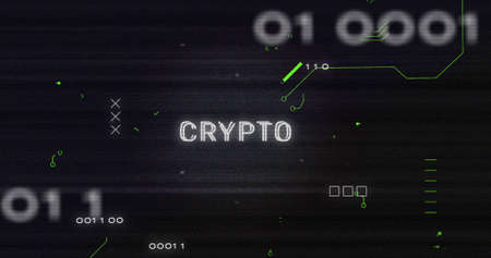 Image of interference over crypto text, data processing and computer circuit board. global technology, computing and digital interface concept digitally generated image.