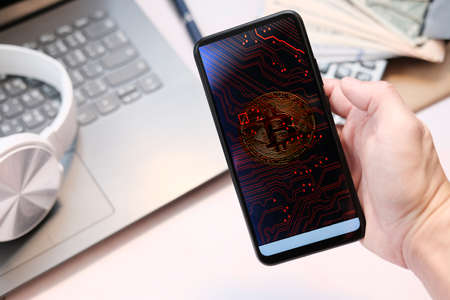 Cryptocurrency graph as Bitcoin graphs on the device as computer laptop, smartphone at home. Young money investing concepts.