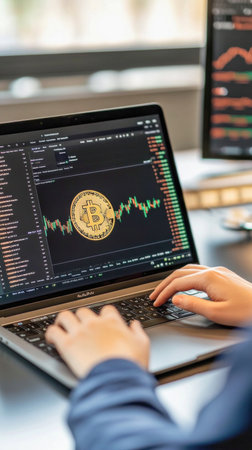 Trader analyzing cryptocurrency bitcoin price chart using laptop, monitoring market fluctuations and making investment decisions in office
