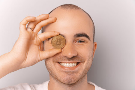 A joyful man is holding a bitcoin above his eye