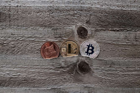 Digital currency physical gold silver and brass coins. Dogecoin, Litecoin and Bitcoin.