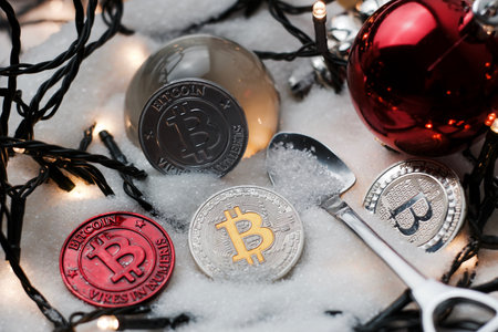 Digital currency physical metal bitcoin coin. Crypto currency christmas snow composition.