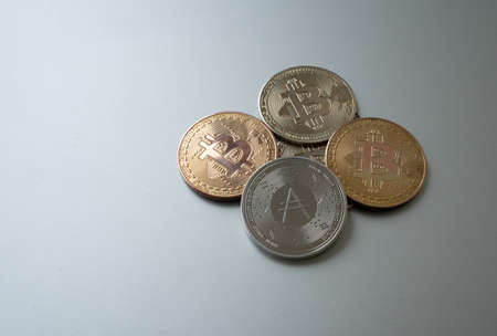Crypto currency background with various of shiny silver and golden physical cryptocurrencies symbol coins, Bitcoin, Ethereum, Litecoin, zcash, ripple.
