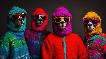 Generative AI, Group of positive different colors Lamas, funny animals. Individuality, independence, think different, creative idea, diversity and inclusive concept.