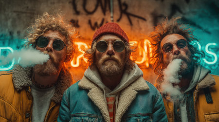 Three friends gather in an urban environment, wearing stylish outerwear and sunglasses. They exhale smoke with a colorful neon backdrop, reflecting a laid-back atmosphere during the night.