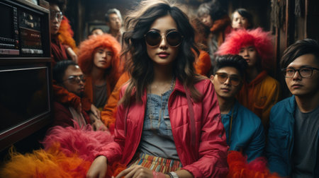 A trendy group of friends poses against a pink wall, wearing bold and eclectic fashion. Their unique styles and accessories highlight a creative and urban lifestyle.. AI Generation