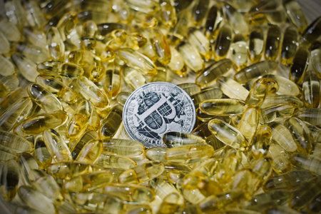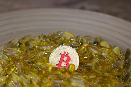 Digital currency physical metal bitcoin coin and yellow pills. Medical bitcoin concept.