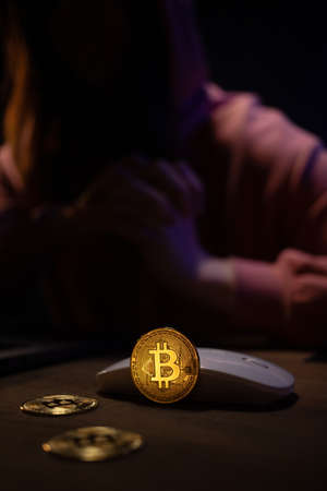 Cryptocurrency physical metal bitcoin coin. Digital currency virtual money concept.