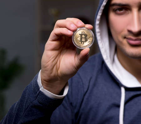 Young man in bitcoin mining concept