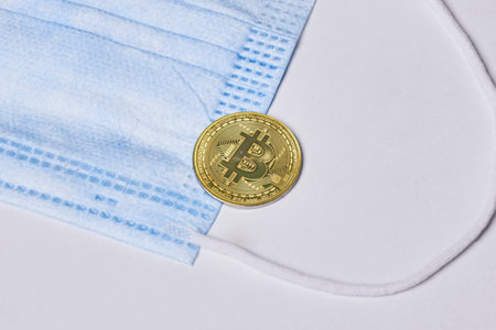 Gold Bitcoin coins with a medical mask. A business finance concept