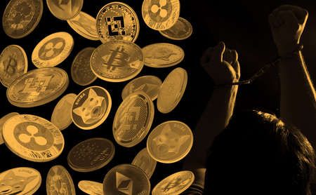 Hands in handcuffs and cryptocurrencies over dark background. Crypto crime concept.
