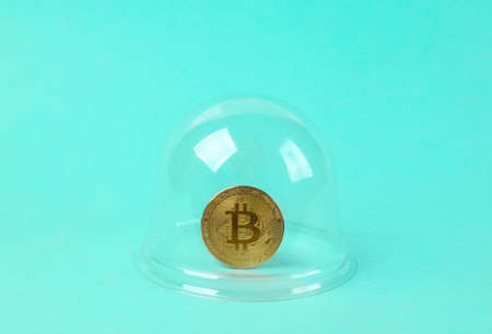 Golden bitcoin under transparent dome on a blue background. protection, isolation concept. minimal layout
