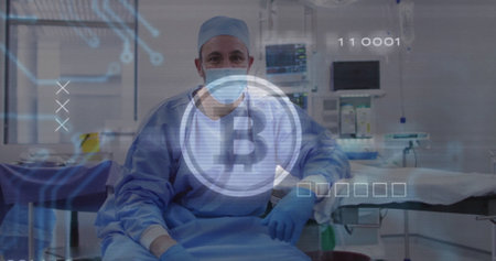 Sitting surgeon wearing blue scrubs and mask in hospital operating room, with Bitcoin logo overlay. Medical, healthcare, technology, innovation, enterprise, professional, futuristic