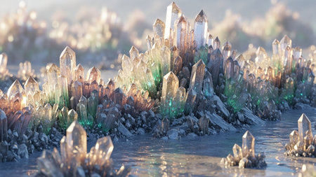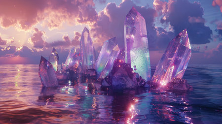 AI Generated. A breathtaking view of colorful crystal formations reflecting in water