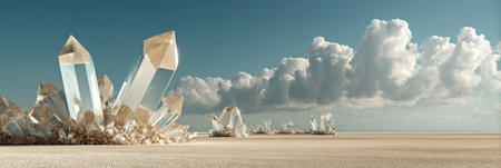 Tall crystal formations emerge from the sandy landscape, glistening under a clear sky, with wispy clouds creating a serene backdrop at midday.