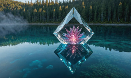 A crystal sculpture floats on a serene lake, surrounded by a dense forest in the early morning