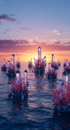 Vibrant crystal formations float gracefully in clear aqua water, showcasing intricate reflections of sunlight, evoking beauty and tranquility in nature.
