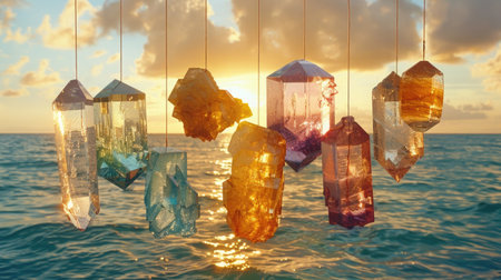 Crystals of Various Shapes and Colors Hanging Against a Serene Ocean Background