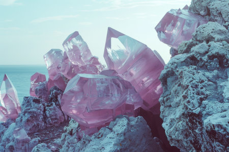 Gemstones showing crystal mountain landscape with sparkling gemstones and reflective water surface keywords: crystal mountain, gemstone landscape,...