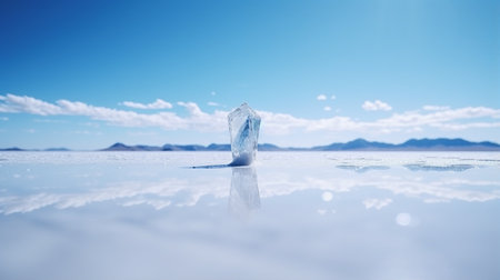 Mirror effect in Uyuni salt flat with mountains and clouds in the view