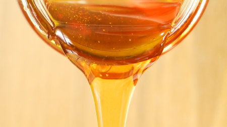 Golden honey drizzling onto rustic wooden surface with bubbles.