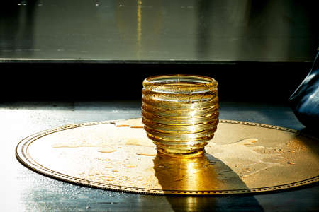 Close up shot of honey pouring out of glass jar. Health and beauty product sustainable lifestyle concept.