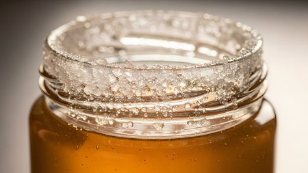 A macro close-up of the rim of a glass jar filled with golden honey or syrup. The rim is heavily encrusted with crystallized sugar granules, highlighting the texture and sweetness of the natural product.