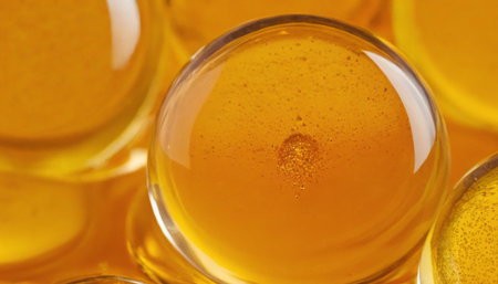 An extreme macro focuses on multiple transparent spheres, each filled with a vibrant golden honey liquid. The spherical shapes create interesting reflections and refractions of light, highlighting the viscous, amber-colored contents. The texture within the spheres appears rich and slightly granular, with small air pockets adding visual depth. This abstract arrangement of honey-filled orbs evokes a sense of concentrated sweetness and natural energy.