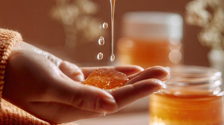 A serene close-up captures honey droplets falling from a hand, with natural skincare products blurred in the background, evoking a sense of wellness and indulgence.