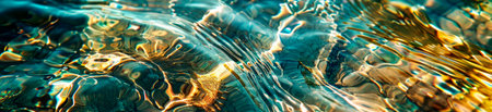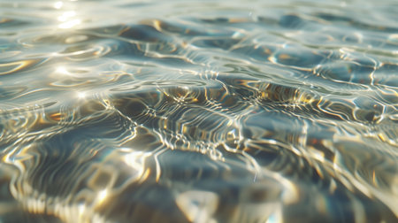 Close-up of transparent water surface with ripples and reflections, featuring silver veins. The sparkling golden light on the waters surface. Generated by artificial intelligence.
