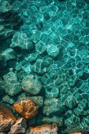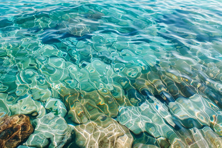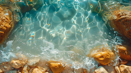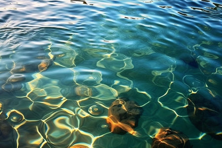 This image captures the serene beauty of crystal clear water gently reflecting sunlight, accompanied by natural stones at the edge, creating a tranquil outdoor scene.