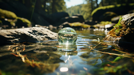 3D drop of water with reflection of nature inside with backdrop of beautiful landscape in river AI