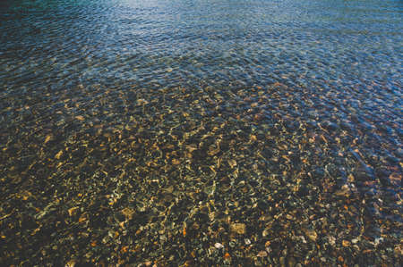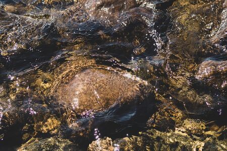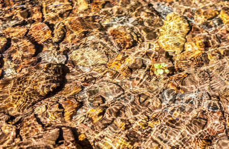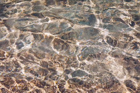 Shiny transparent water. clear water with pebbles and stone on the bottom. shining reflections of sun rays and ripples on the water surface