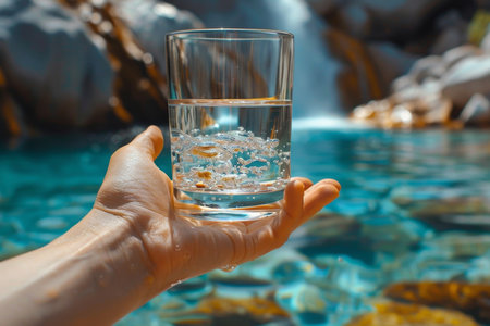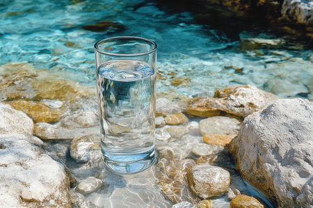 A tall glass filled with crystal clear water stands on smooth stones by a tranquil blue spring. The sunlight reflects off the water, highlighting the natural beauty of the setting with rocks surrounding the area.