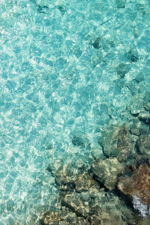 View from above of the crystal clear water along the shoreline with rocky seabed.