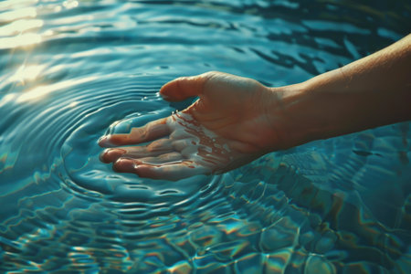 A hand gently touching the water's surface, creating soft ripples and catching the light, symbolizing peace and tranquility.