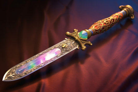 A beautifully ornate dagger rests on richly embroidered fabric, illuminated by soft golden light, showcasing intricate details and cultural significance.